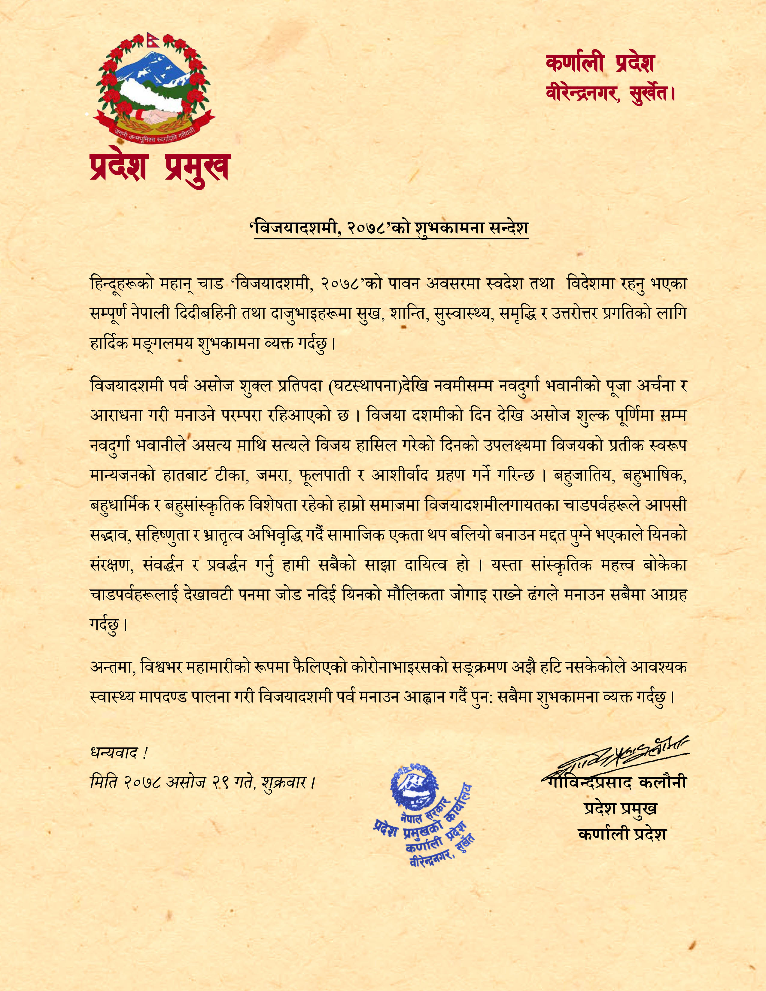वीरेन्द्रनगर : कर्णाली प्रदेशका प्रदेश प्रमुख गोविन्दप्रसाद कलौनी ‘विजयादशमी, २०७८’को शुभकामना दिएका छन् । उनले विहिबार एक शुभकामना सन्देश जारी गर्दै कर्णालीवासी लगायत सम्पुर्णमा शुभकामना व्यक्त गरेका हुन् ।
