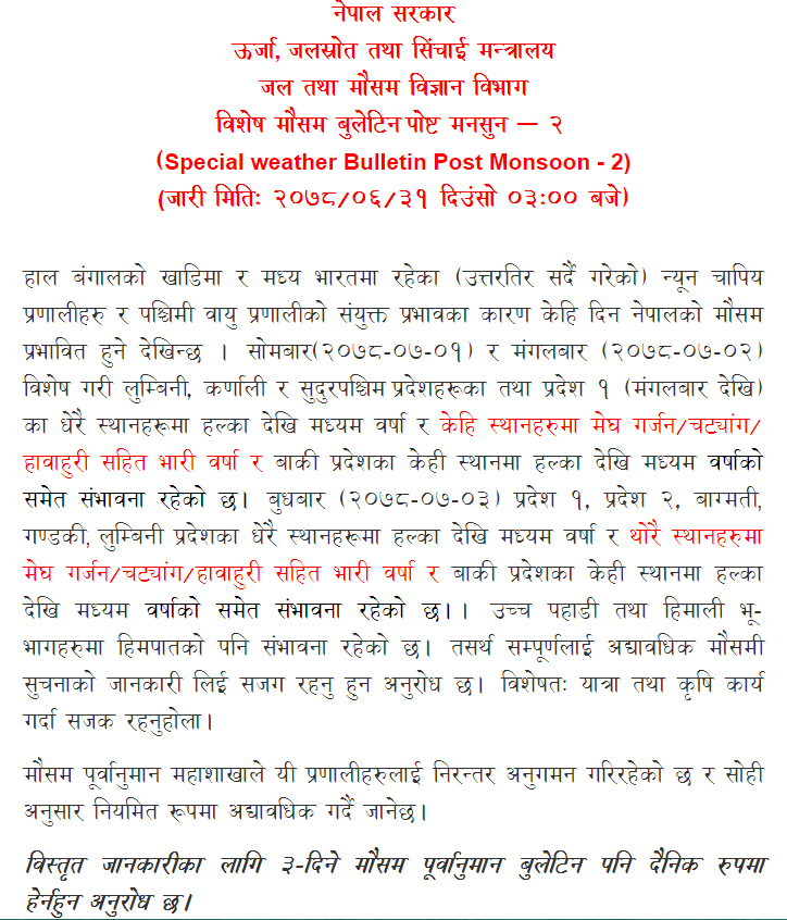 ‘भेरी, कर्णाली, महाकाली, सेती, र सुदूरपश्चिम प्रदेशको मध्यपहाड, चुरे र तराई भई बहने स–साना नदीहरुमा बहाब उल्लेख्य बढ्ने र केहीमा सतर्कता तह आसपास पुग्न सक्ने छ’ महाशाखाले जारी गरेको विज्ञप्तिमा भनिएको छ, ‘कर्णाली, नारायणी, कोशी, तिनाउ, कन्काई नदी तथा कर्णाली, लुम्बिनी, गण्डकी, बागमती प्रदेश, प्रदेश १ को मध्यपहाड, चुरे र तराई भई बहने स(साना नदीहरुमा बहाव बढ्ने र केहीमा आकस्मिक बहाब बढ्न सक्ने पूर्वानुमान रहेकाले उल्लेखित नदीहरुका तटीय क्षेत्रहरूमा उक्त अवधिभर विशेष सावधानी अपनाउनहुन अनुरोध छ।’