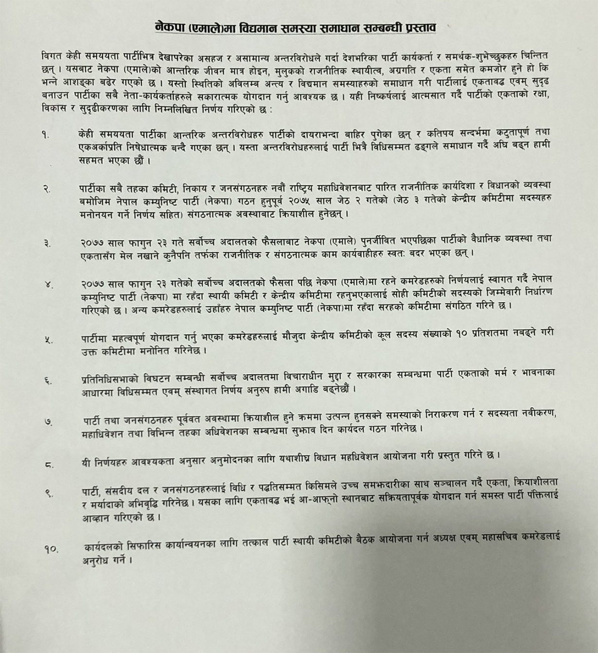 लामो प्रयासपश्चात अन्ततः नेकपा एमालेमा पार्टी एकताका लागि १० बुँदे सहमति भएको छ । यो सहमति ओली र माधव नेपालको समर्थनमा गरिएको छ । यसलाई अनुमोदन गर्नै बाँकी छ । १० बुँदे सहमतिले नेकपा एमालेभित्रको अहिलेको विवाद अन्त्य गर्ने विश्वास छ ।